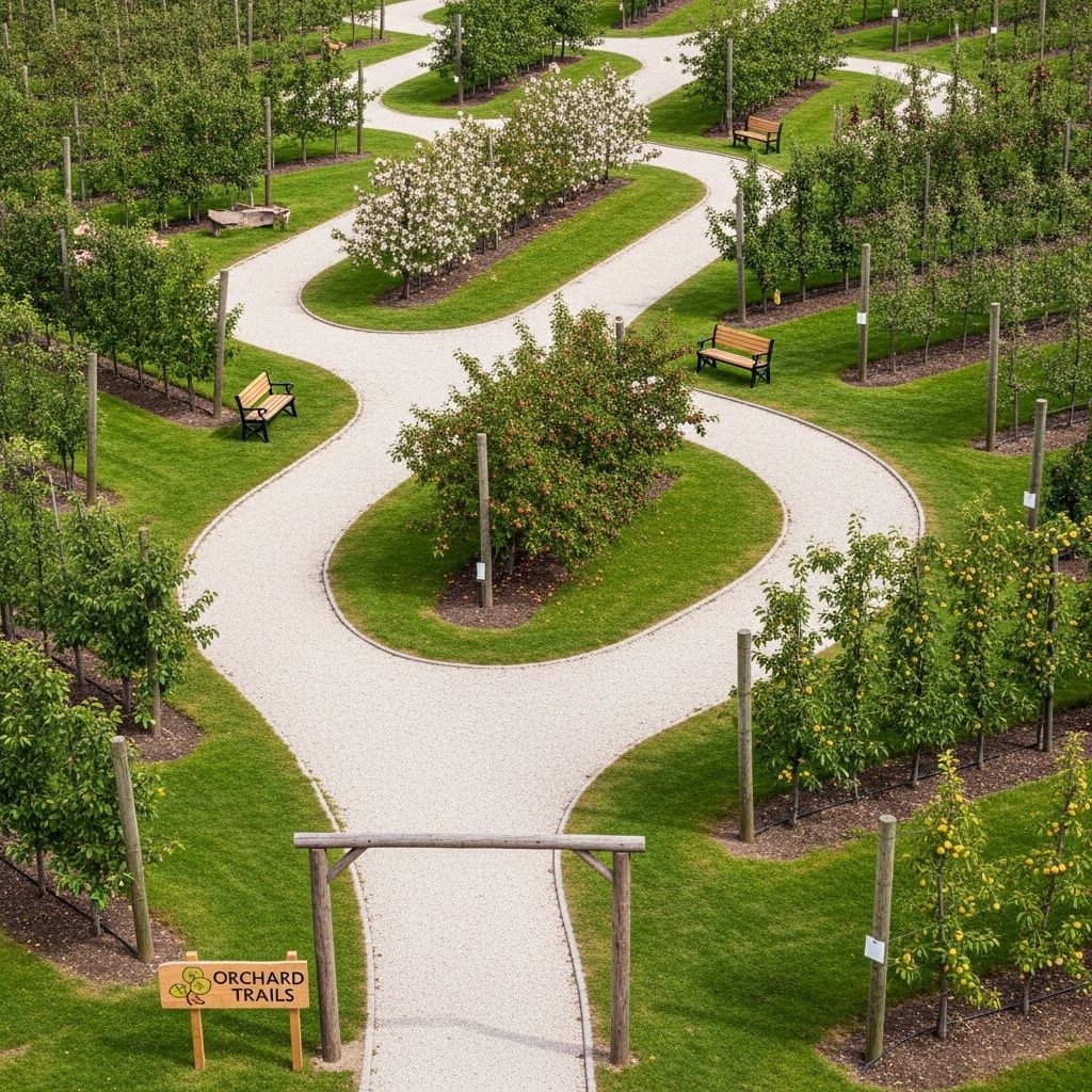 Defined paths improve access and organization. They make pruning and harvesting easier. Paths also guide visitors through the orchard. This design enhances usability and appearance. It works well for family or public orchards.