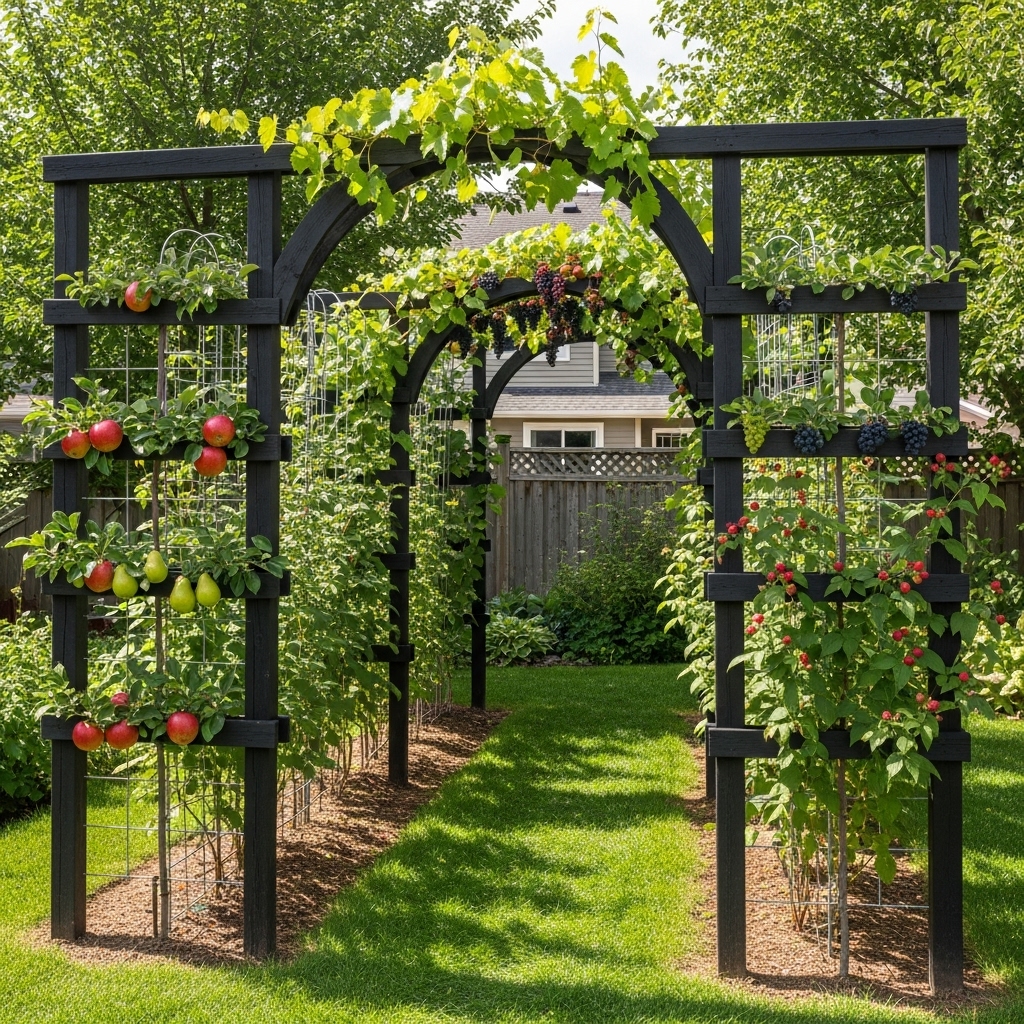 Vertical structures maximize limited space. Trellised fruit trees grow efficiently upward. Sunlight reaches branches evenly. This method suits modern backyards. It combines function with visual interest.