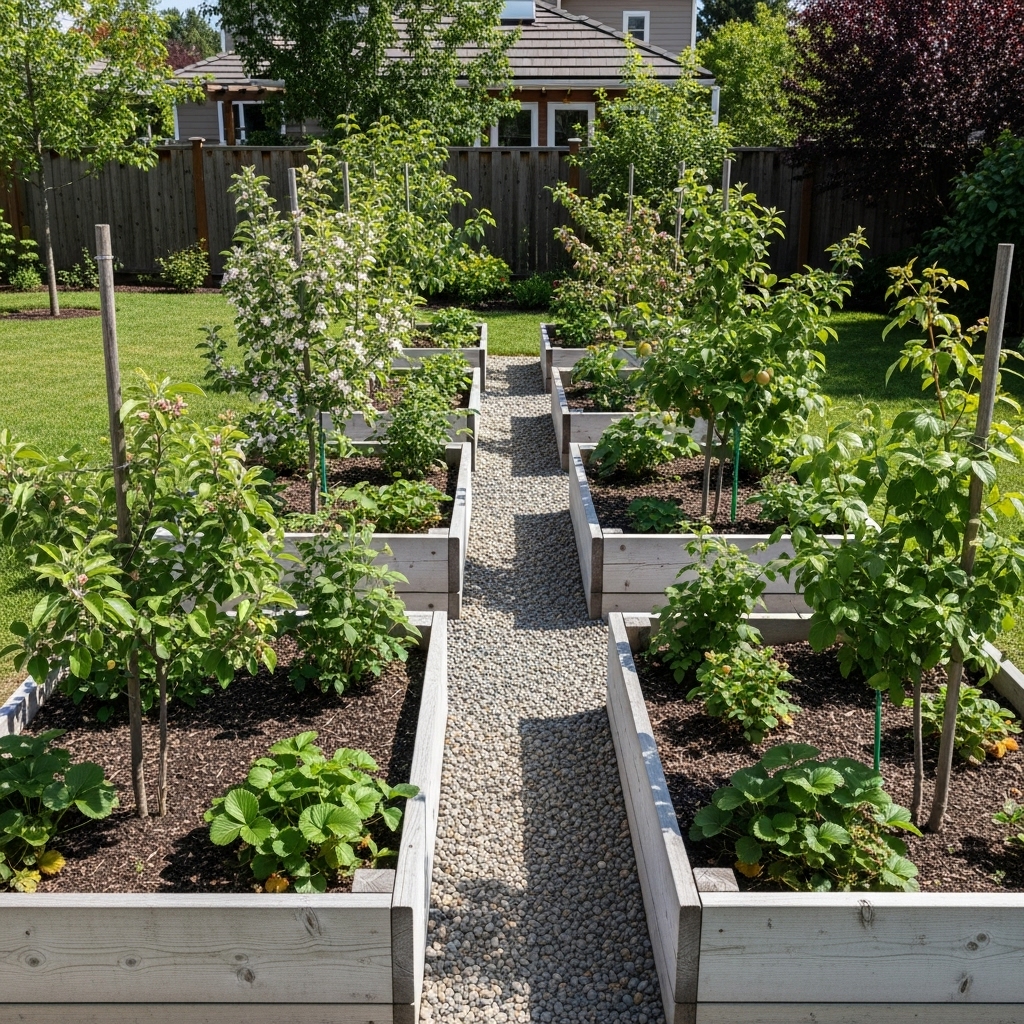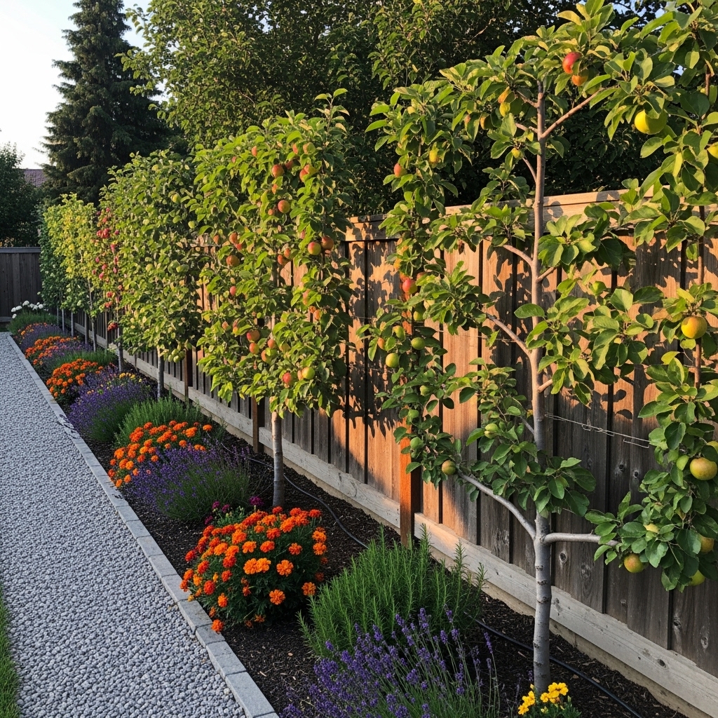 Using fruit trees as borders defines space beautifully. They provide structure and privacy. Borders maximize edge areas. The layout feels intentional. This works well along fences.