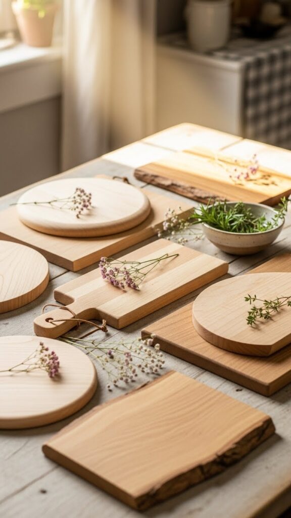 Wooden cutting boards are a staple in cottagecore kitchens. Their natural grain adds warmth and character to countertops. When left on display, they double as décor. Light wood tones work especially well with soft color palettes. These pieces feel both functional and nostalgic.