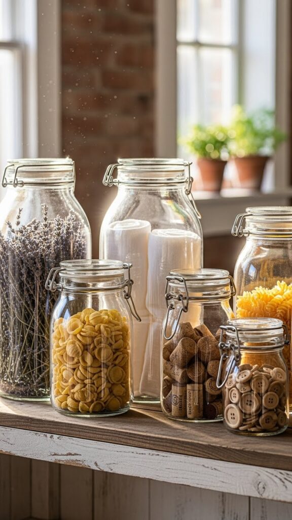Glass jars are both practical and visually appealing in cottagecore interiors. They create a sense of openness while keeping everyday items organized. Clear glass reflects light beautifully and feels timeless rather than trendy. These jars work well in kitchens, bathrooms, and craft spaces. Open storage adds character without clutter.