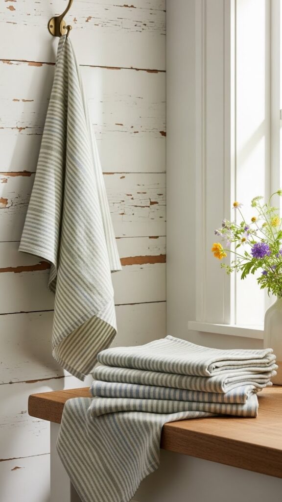 Soft, neutral tea towels instantly bring a cottage-inspired feel to kitchens. Linen-look fabrics add texture and warmth without feeling heavy. These towels feel practical yet decorative when draped over handles or hooks. Subtle stripes or muted colors enhance their charm. Everyday textiles play a big role in cottagecore styling.