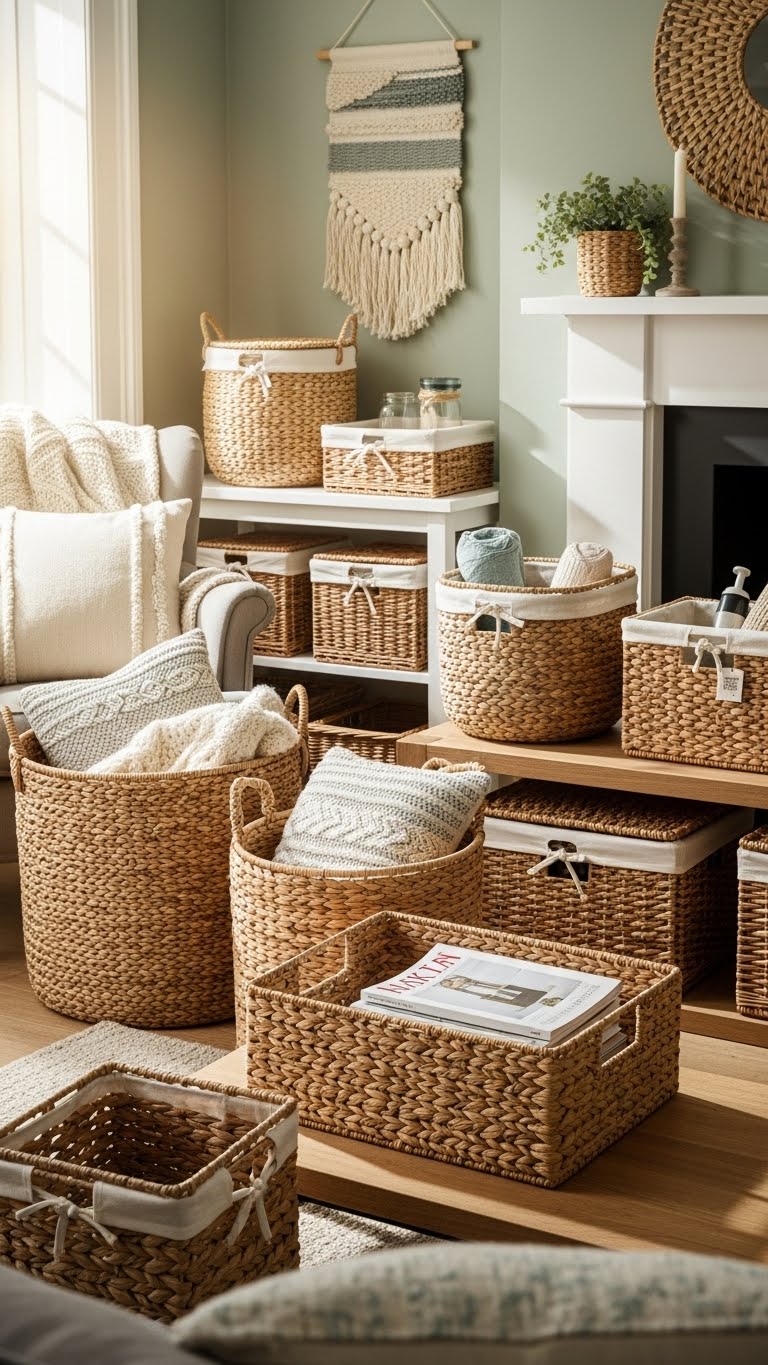 Woven baskets add texture and warmth to cottagecore interiors. They are perfect for storing blankets, magazines, or everyday essentials. Natural fibers bring balance to soft color palettes. Baskets feel practical yet decorative. They support an organized but relaxed home.