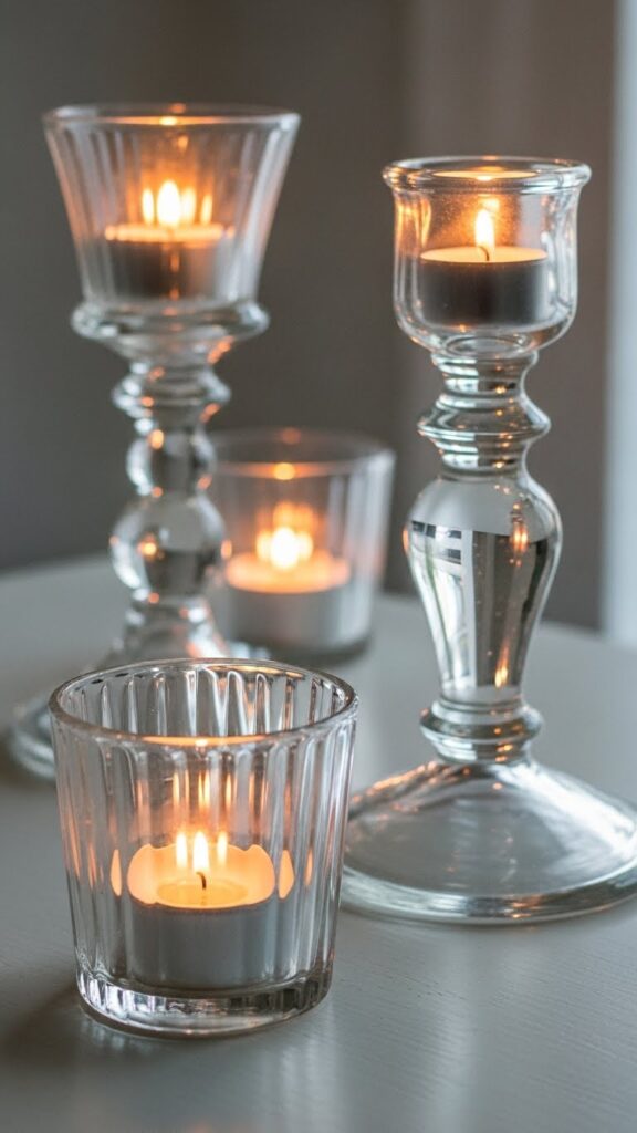 Glass candle holders create a soft glow that enhances a cottagecore atmosphere. Clear or lightly textured glass feels delicate and romantic. Candlelight adds warmth during evenings and quiet moments. These pieces layer well with other décor. Gentle lighting is essential for a cozy home.
