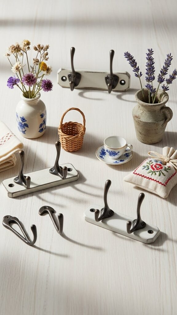 Wall hooks are both functional and decorative. Light finishes blend well with cottagecore interiors. They provide storage without visual heaviness. Hooks help keep spaces organized. Practical solutions can still feel charming.