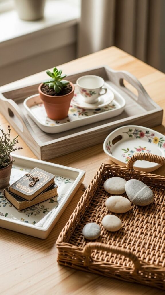 Decorative trays help organize surfaces while adding charm. Light wood or ceramic trays feel natural and soft. They create intentional groupings on tables or countertops. Trays add structure without clutter. Function and beauty go hand in hand.