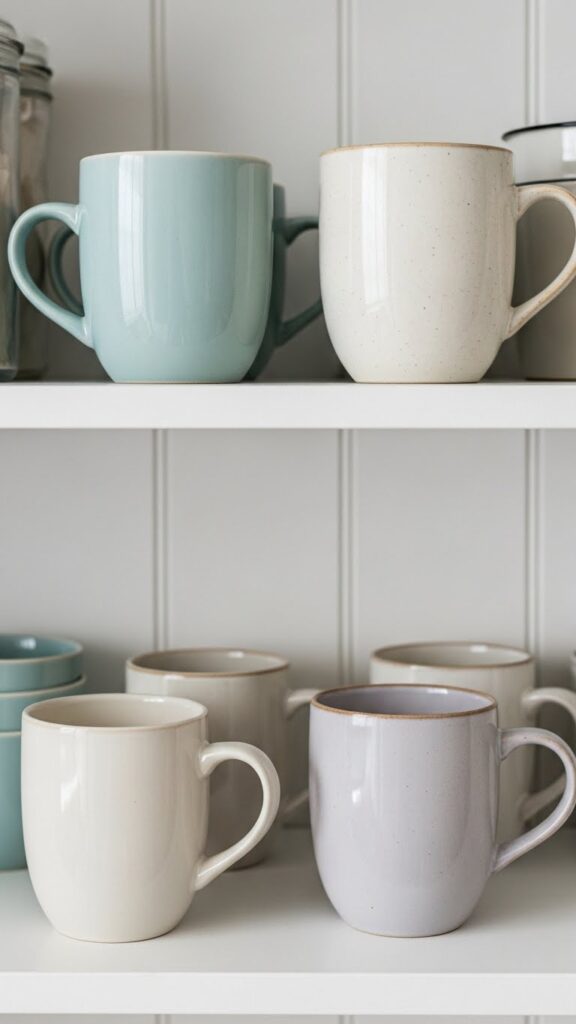 Ceramic mugs with classic shapes bring a cozy, lived-in feel to any kitchen. Soft colors and slightly rounded forms feel comforting and timeless. These mugs look beautiful displayed on open shelving. They encourage slow mornings and relaxed routines. Everyday rituals matter in cottagecore spaces.