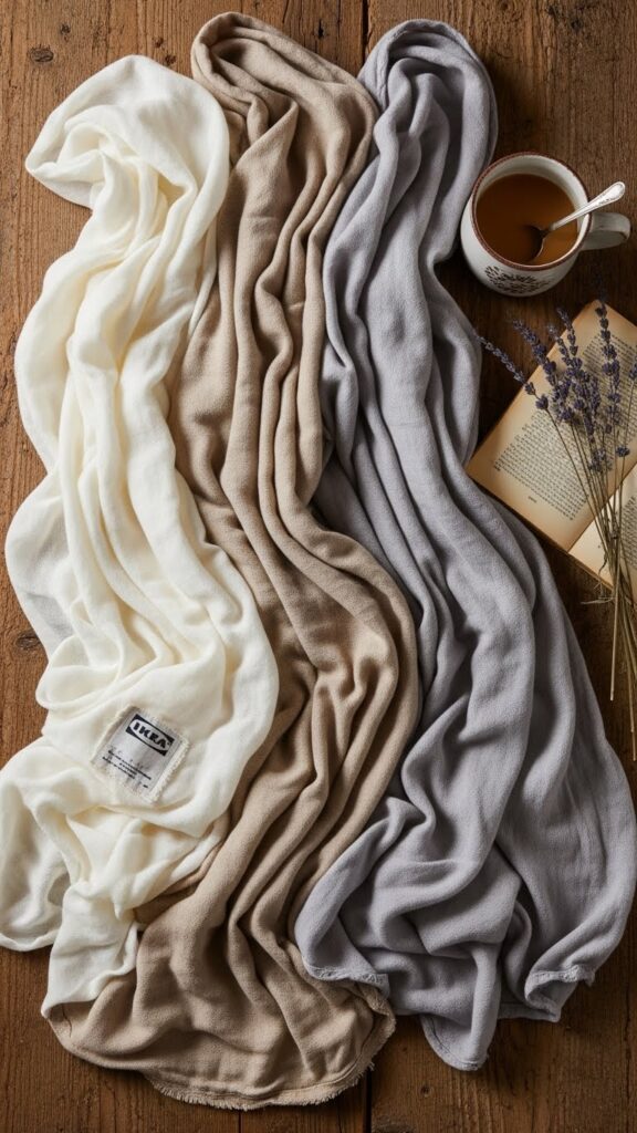 Cotton throws add comfort and softness to sofas or beds. Light textures work well year-round. Neutral colors keep the look timeless. Throws encourage relaxation and warmth. Cozy layering is key to cottagecore design.