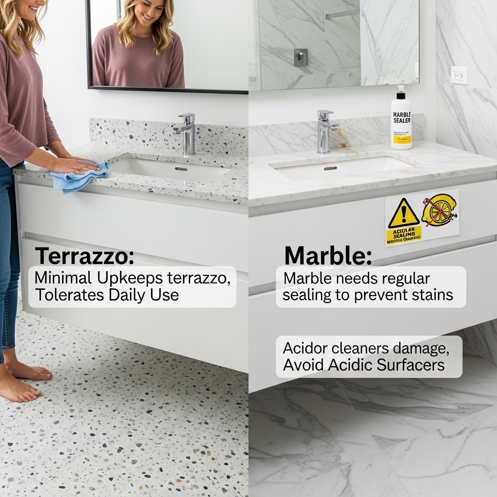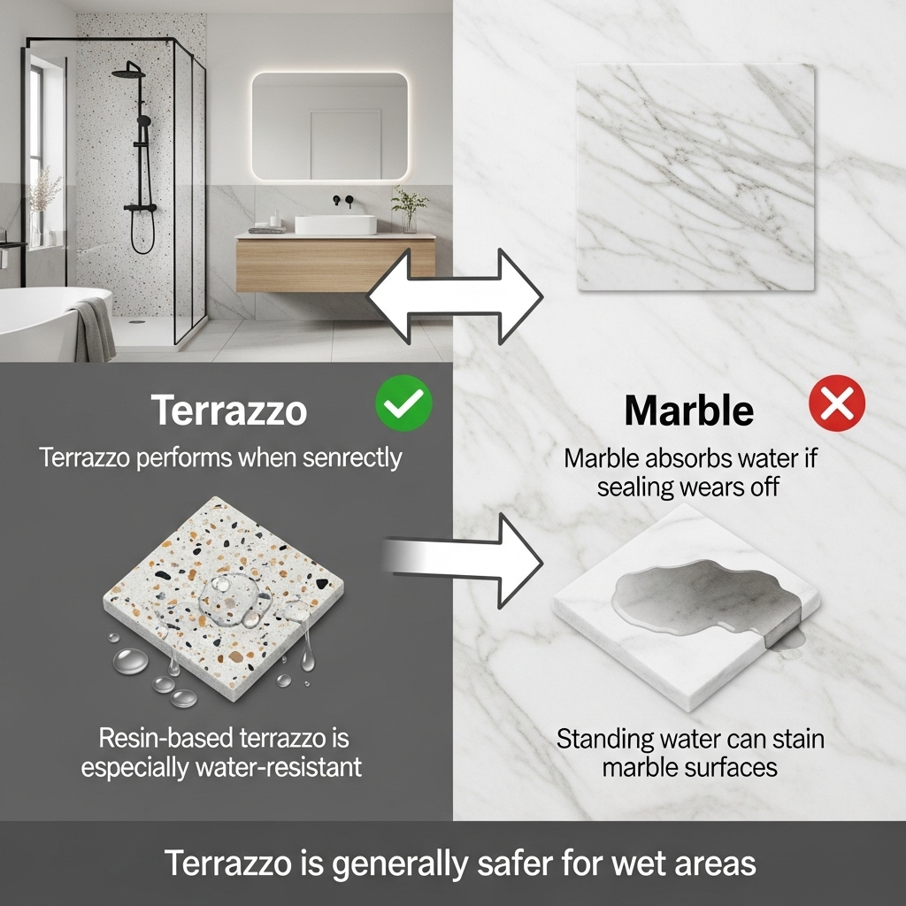 Terrazzo generally outperforms marble in longevity under bathroom conditions.